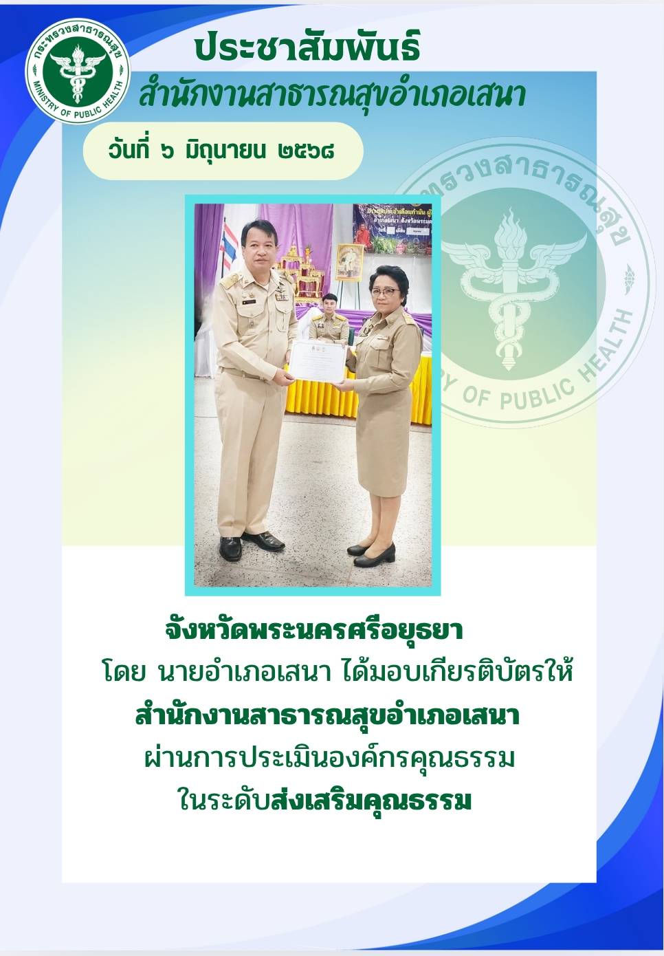 ได้รับเกียรติบัตรองค์กรคุณธรรม ผ่านเกณฑ์เป็นองค์กรส่งเสริมคุณธรรม